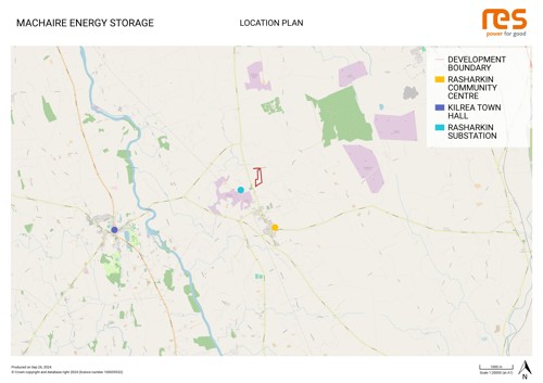 The proposed Machaire Energy Storage System is located on land approximately 600m northeast of the Rasharkin substation, in the townland of Magheraboy, approximately 1km north of Rasharkin, Co. Antrim.Click on image to enlarge